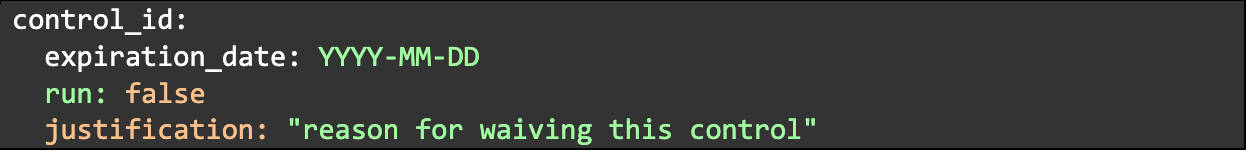 - run - When false, the control will not be run. When true, the control will run and be reported, but failures in it won’t make the overall run fail.