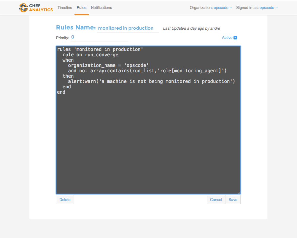 We have expanded the destinations you can send notifications to in Chef analytics 1.1, adding a configurable Webhook as well as E-mail notifications. In order to ease integration we have published an example Webhook server which you can extend and modify.