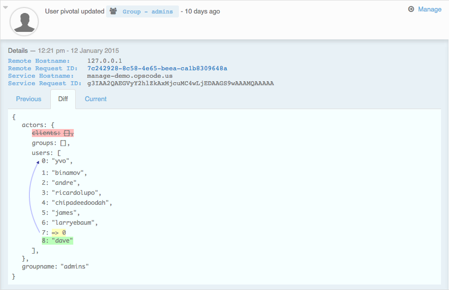 Users can now view Github-style diffs of Chef actions via the Chef Analytics gui: