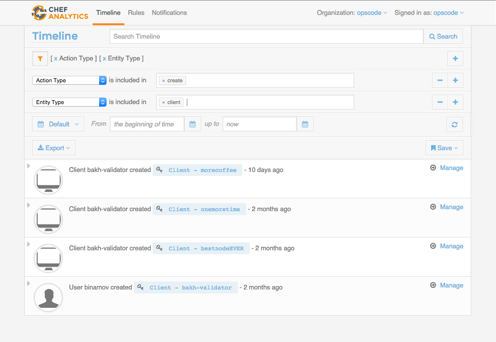 Along with `actions`, which were available in Chef analytics 1.0, we have added integration with Run Reporting and Chef Client audit controls.