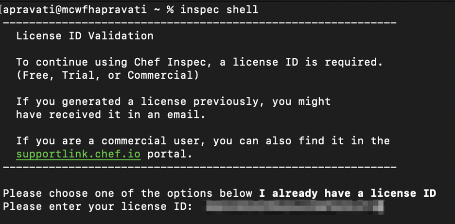 $ inspec shell. - Select the second option (I don’t have a license ID…).