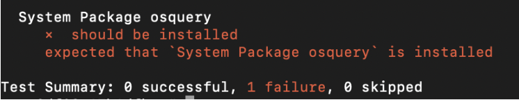 Example of failed test case – You’ll be testing for the package Osquery installed on your target node, which is not the case. So, the resulting result is failed.