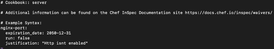 inspec execcommand by using the--waiver-fileswitch. - Declared in the cookbook’s attributes file.