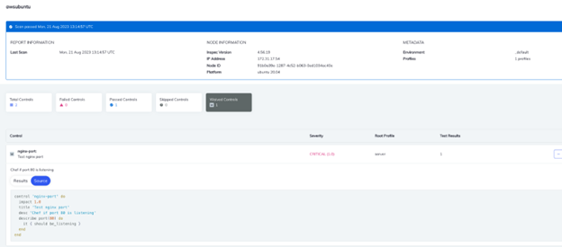 nginx-port is skipped,and the other two controls are executed. $ sudo chef-client command will execute the cookbook in the target node along with all the recipes, compliance and waivers files.