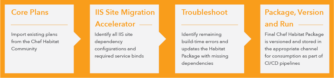 The Chef Windows IIS Site Migration Accelerator scans your servers, identifies the sites running IIS and then generates Habitat plans to allow you to put those applications into a test environment and make sure everything is running correctly.