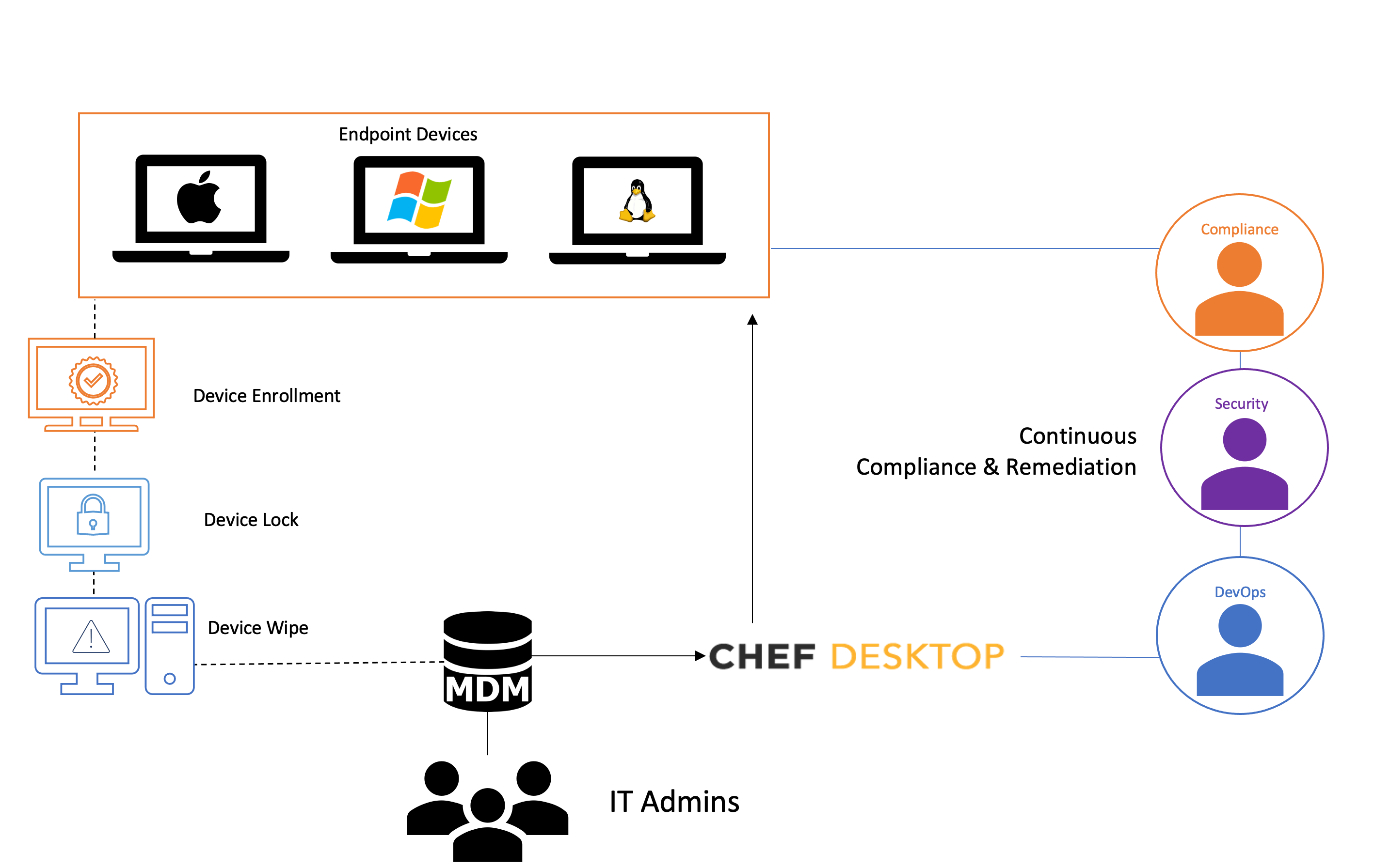 IT admins use MDMs to perform core tasks like wipe/lock, device enrolments, zero-touch provisioning, etc. These MDMs can also be used to deploy the Chef client on end points. IT admins then upload configuration details along with compliance profiles and remediation content in the form of code to Chef Desktop. The Chef Clients running on the endpoints then pull these configurations from Chef Desktop and bring themselves to the desired state securely.