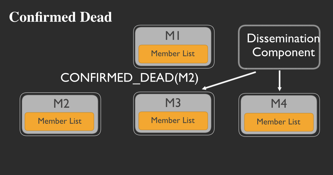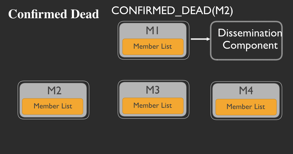 When a member does not get an ACK message back after pinging another member, then it initiates and investigation. If there is still no ACK message received after the investigation, the member mark the unresponsive member as confirmed dead in its member list. It will then send a message to the dissemination component: