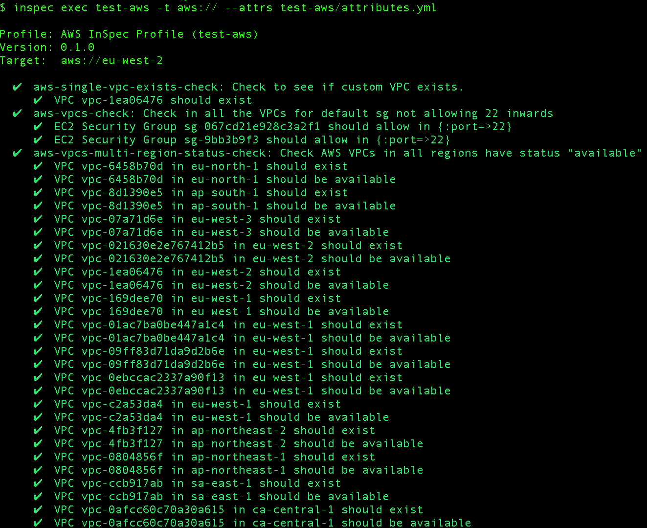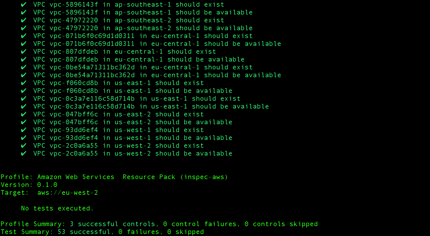This is a nice opportunity to highlight the multi-region capability of InSpec AWS resource pack. The default region in this case is `eu-west-2` but our sample control allows to target resources across all regions with a few lines of readable test code.
