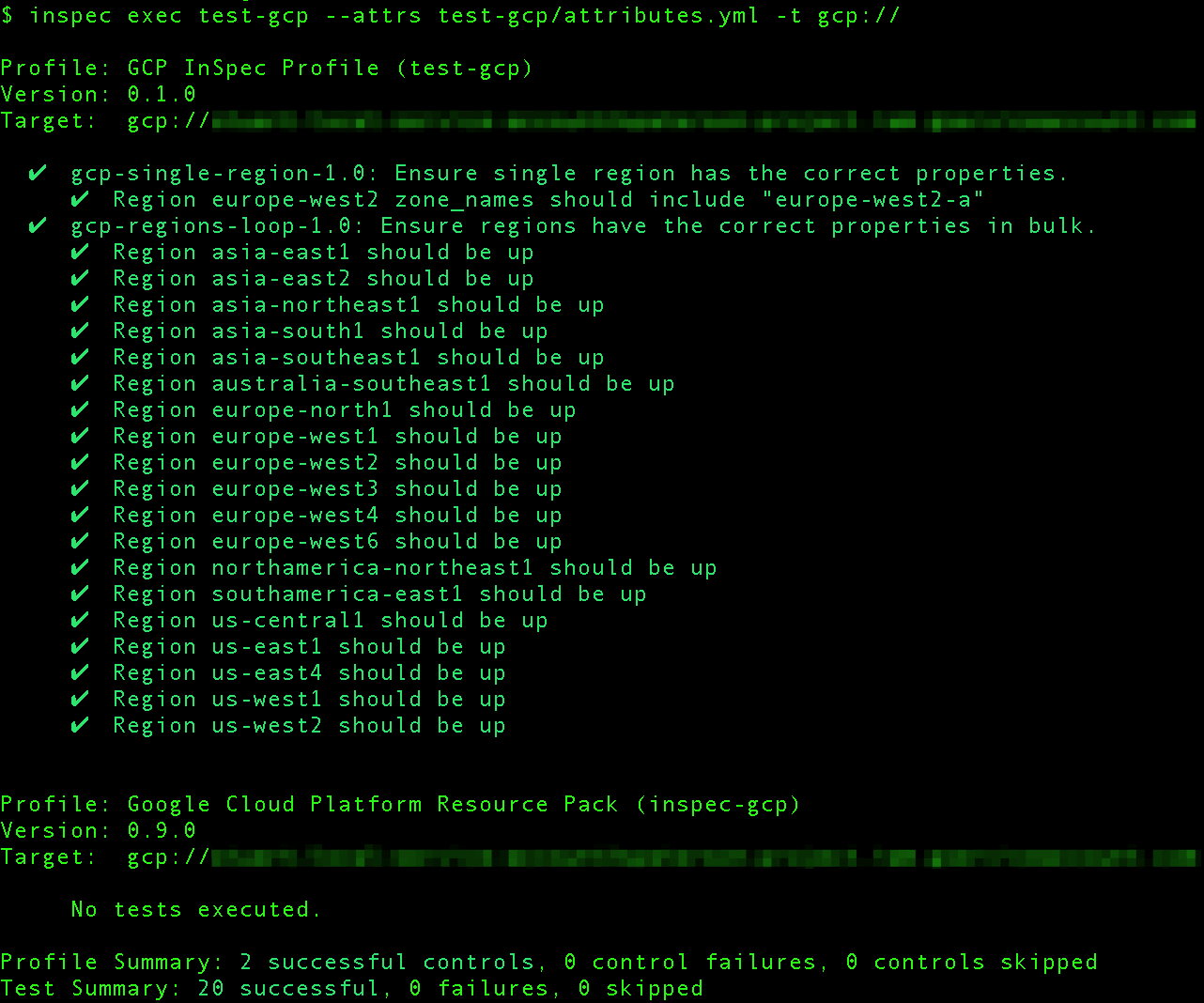 Amongst other things, this highlights how single and plural InSpec resources can be used in concert to perform meaningful checks across all GCP regions. Executing the generated profile with InSpec: