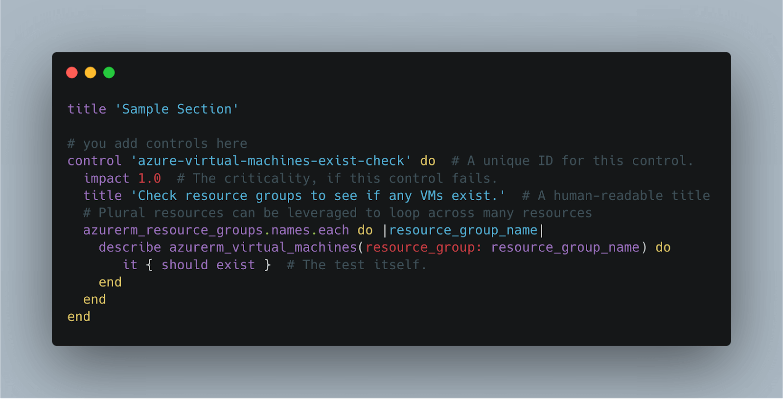 This sample control loops across all resource groups in the Azure subscription and enforces that Virtual Machines should exist in each one. Running this profile with a variety of resource groups we see: