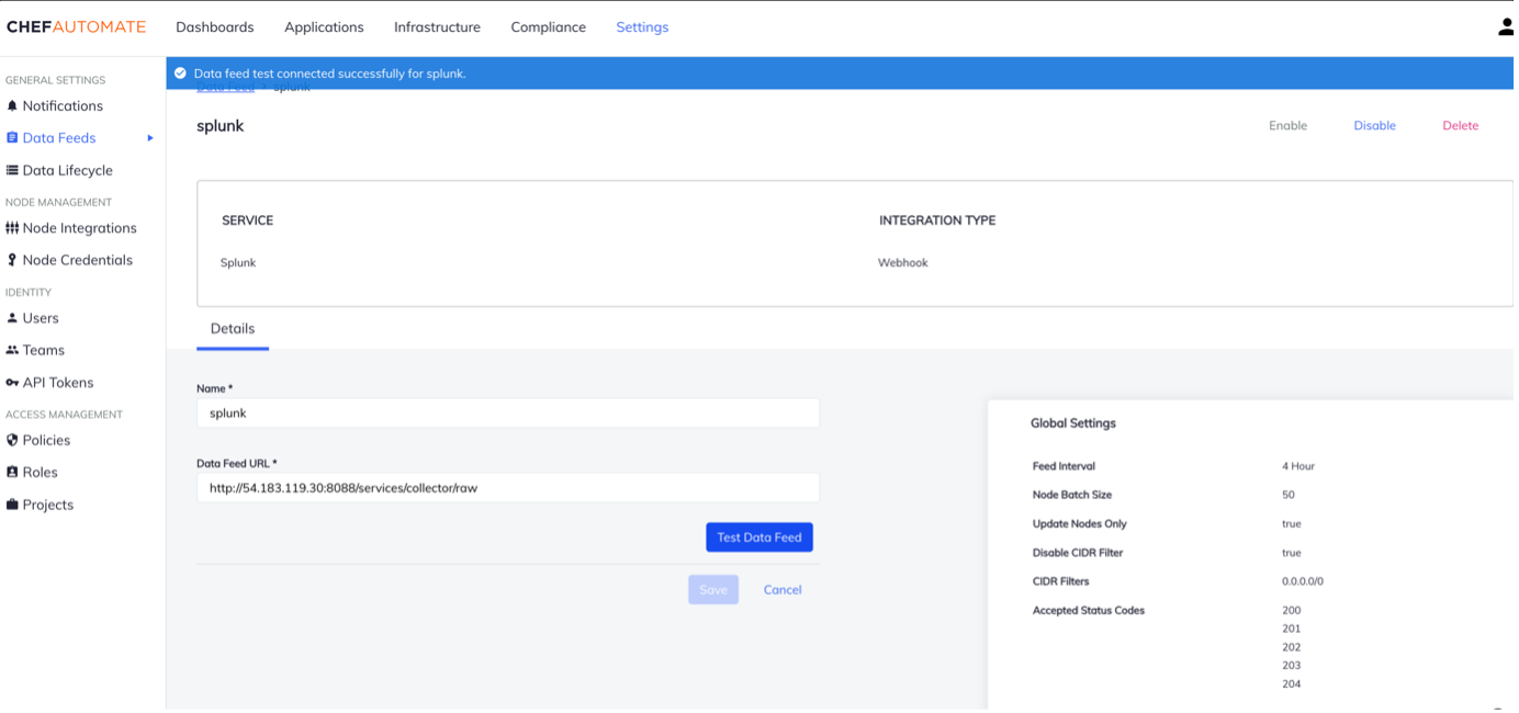 To apply your configuration changes with the Chef Automate command-line tool: $ chef-automate config patch data-feed-patch.toml