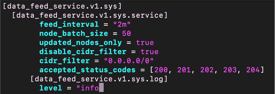 To modify Data Feed behavior with the available configuration settings, create a configuration patch file to update the configuration settings. Save this file in the .toml file format and name your file as desired.