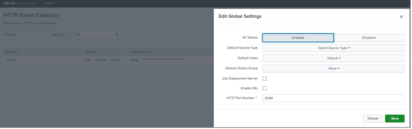 settings>data inputsand create a data input by choosing the HTTP Event Collector (HEC). - Click on the new token and configure it to receive data over HTTP. Select the previously made index to store incoming data as events.