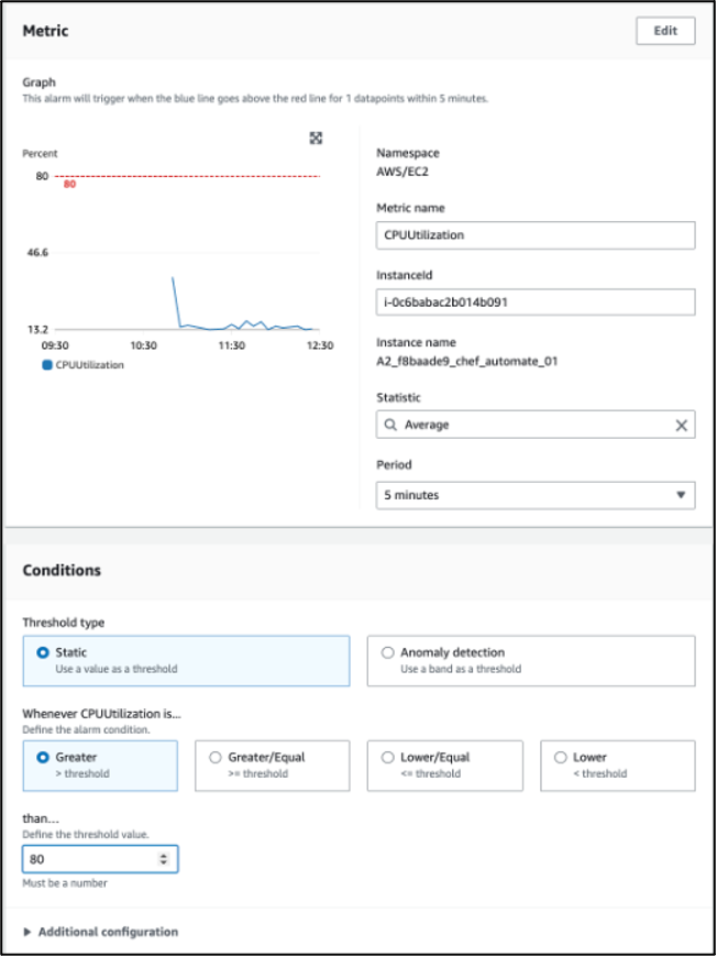 While Dashboards can help effectively oversee various facets of the Chef Automate HA environment, it's impractical to continuously monitor all performance metrics around the clock throughout the entire year for any anomalies. That is where AWS CloudWatch alarms are leveraged, allowing conditions to be defined on the metrics and the ability to trigger alerts to the right teams when the threshold falls outside the expected limits. Teams can then be proactive in looking into potential problems and avoid any kind of disruption whether that be an impact on performance or preventing an outage.