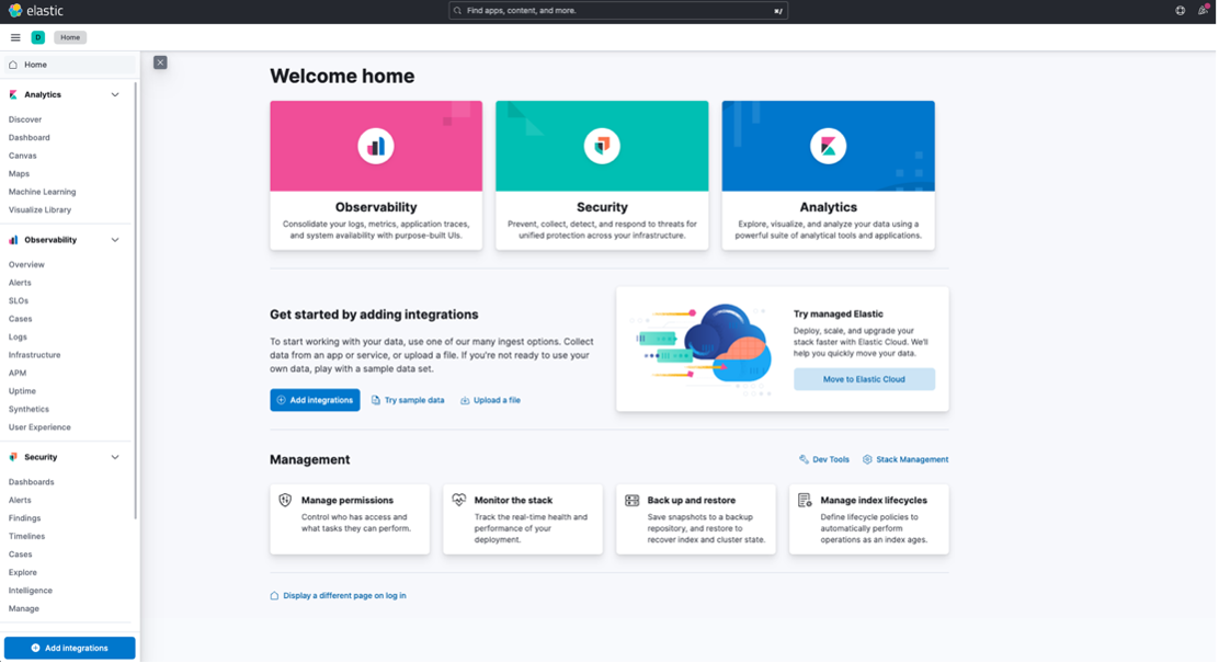 You'll land on the Kibana Home page, your central hub for log analysis and visualization.