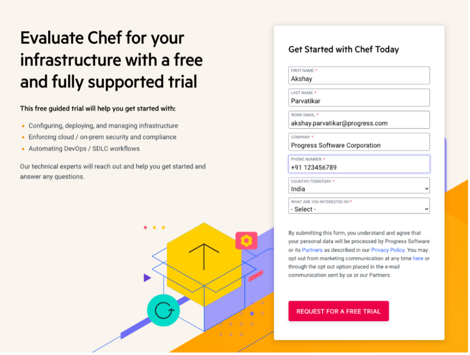 If you are a new user and want to try out any new solutions from Progress, click Free Trial under the For New Chef Users section and fill out all the relevant details. The Chef sales team will contact you and proceed.