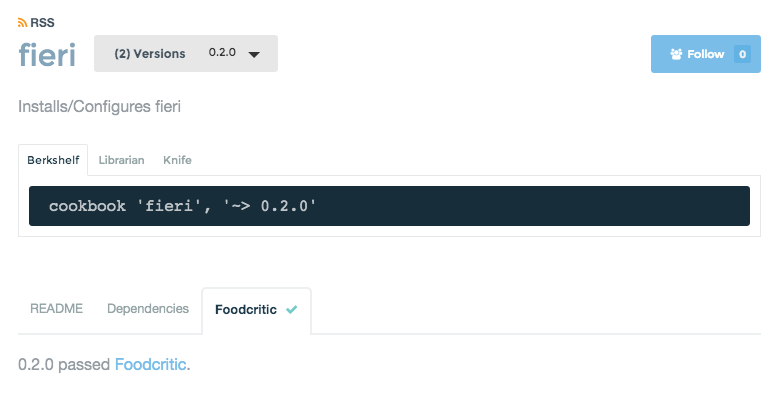 The first is a new tab called “Foodcritic” that shows up when you are viewing a cookbook. Now, when you upload a cookbook, Supermarket will make a background request to a new service we wrote, called Fieri. Fieri will run foodcritic against the cookbook and send the results back to Supermarket. The results are what is shown in the “Foodcritic”