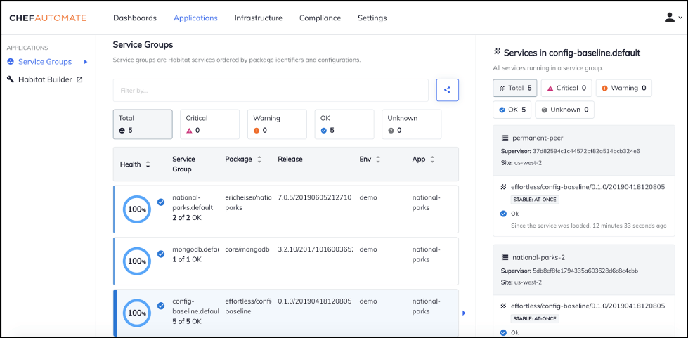 The new Applications tab in Chef Automate shows the service groups and instances that are deployed, and gives you the data you need to understand what’s deployed where and the health of each service. To start using this, you’ll need to configure the event streaming service for Habitat.