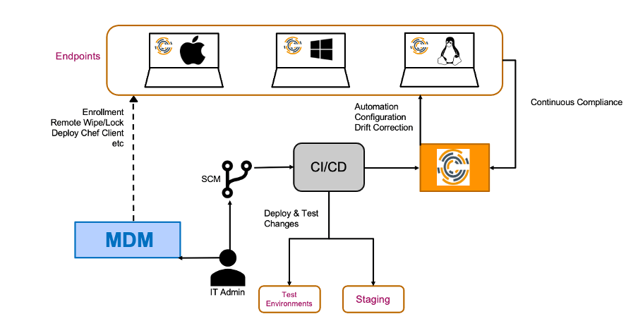 A configuration management tool like Chef not only makes it easy to configure your endpoint state as code compared to writing complex and lengthy scripts, but its “code-first” approach also helps setup an SDLC process ensuring that changes are well vetted and tested before pushing to production. It makes the overall cost of change less expensive and increases IT team productivity. With Chef, it is even possible to perform compliance checks by specifying your compliance policies as code.