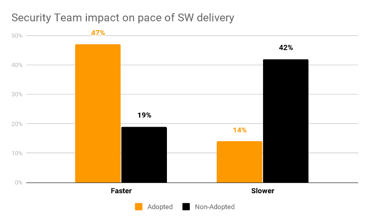 DevSecOps impacts the pace AND quality of the software delivered. The survey results showed that 47% of adopters believe DevSecOps increases their speed with 42% of non-adopters say it slows them down. As far as quality is concerned, 84% of respondents believe DevSecOps improves the quality of the software delivered.