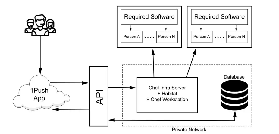 1Push works by allowing IT teams to set up their Chef Infra server and Chef automate server and add any number of recipes they want to run on their systems. Every system/on-premise server will be a “Node”, and multiple nodes that serve the same purpose can be collected into ”Groups”.