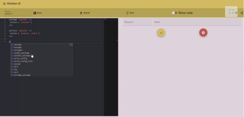 Kitchen UI allows users to create and edit Chef recipes and cookbooks interactively in the browser. It uses suggestive typing and autocompletes selection to make the automation process faster and more efficient.