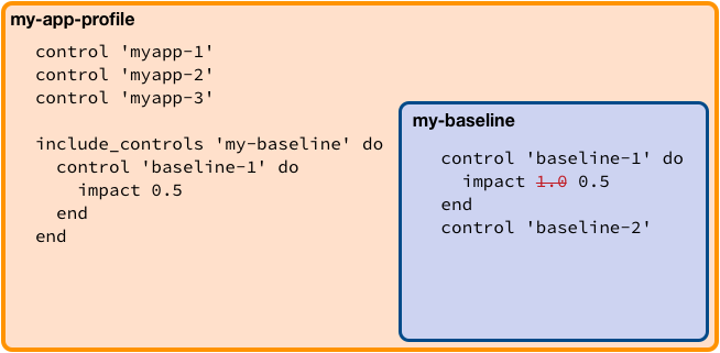 In the above example, all controls from my-baseline are executed along with all the controls from the including profile, my-app-profile. However, should control baseline-1 fail, it will be raised with an impact of 0.5 instead of the originally-intended impact of 1.0.