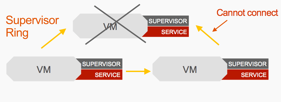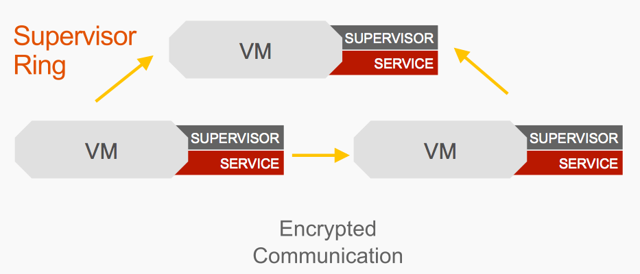 The supervisors on each of these virtual machines form a ring. They will use that key we used to sign the package to decide whether to allow another virtual machine into the ring. They all have to be signed with the same key in order to communicate with each other. They do this communication over an encrypted GOSSIP protocol which they can then use to self organize into different topologies – we’ll cover those topologies a little later.