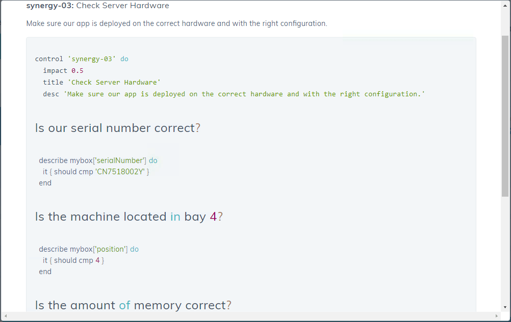 First let’s take a peek at the Synergy node which is passing all its tests. Below is the InSpec code that was used to make sure our application was deployed onto the correct hardware. InSpec is even easier to learn than Chef, so you can quickly develop rule sets for all your QA and audit needs: