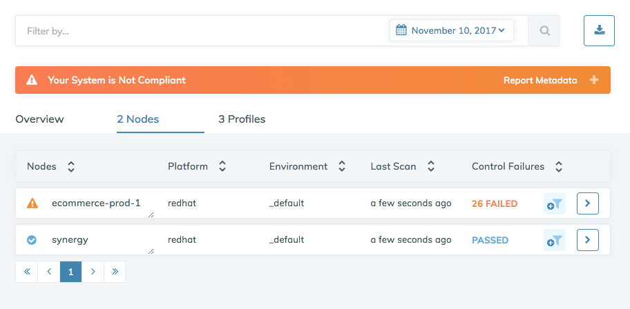 But what about security and compliance? For that we head over to the Compliance tab of Chef Automate. Chef Automate is not just for building machines. You can also use it to scan your entire fleet for compliance and audit status. The compliance dashboard is powered by Chef’s compliance-as-code tool, InSpec. InSpec is a language and framework for describing audit, security, compliance and QA requirements. You can use it to ensure that all your infrastructure is built correctly and stays compliant with internal and external security regulations.