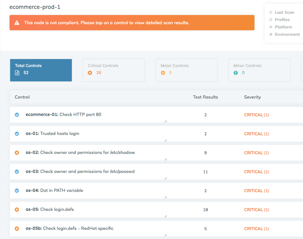 We’re also able to collect compliance data on our OS and applications. In the ecommerce-prod-1 report we see the results of a Linux security baseline scan. Sysadmins can take action on each item and remediate them according to the severity level.